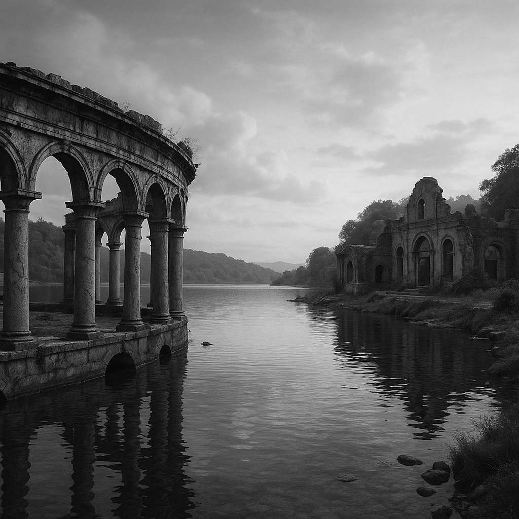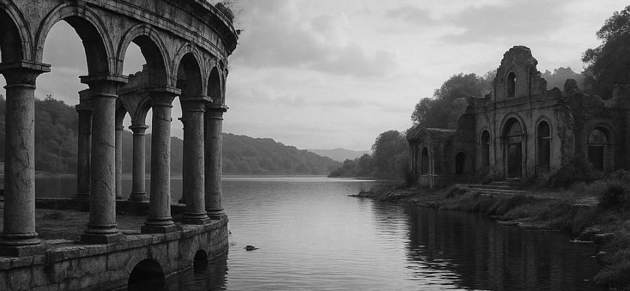 Now, the tracks are rusted, and the station clock has stopped at twenty-two past four. The only sound is the wind playing among broken shutters. The lake still lies calm, though no one bathes in it. The once-famous Grand Colonnade stands half-submerged, its marble columns tilted like teeth in an aging smile. Water drips perpetually from the arches into the pools below, forming rings that expand and vanish like unremembered applause.
